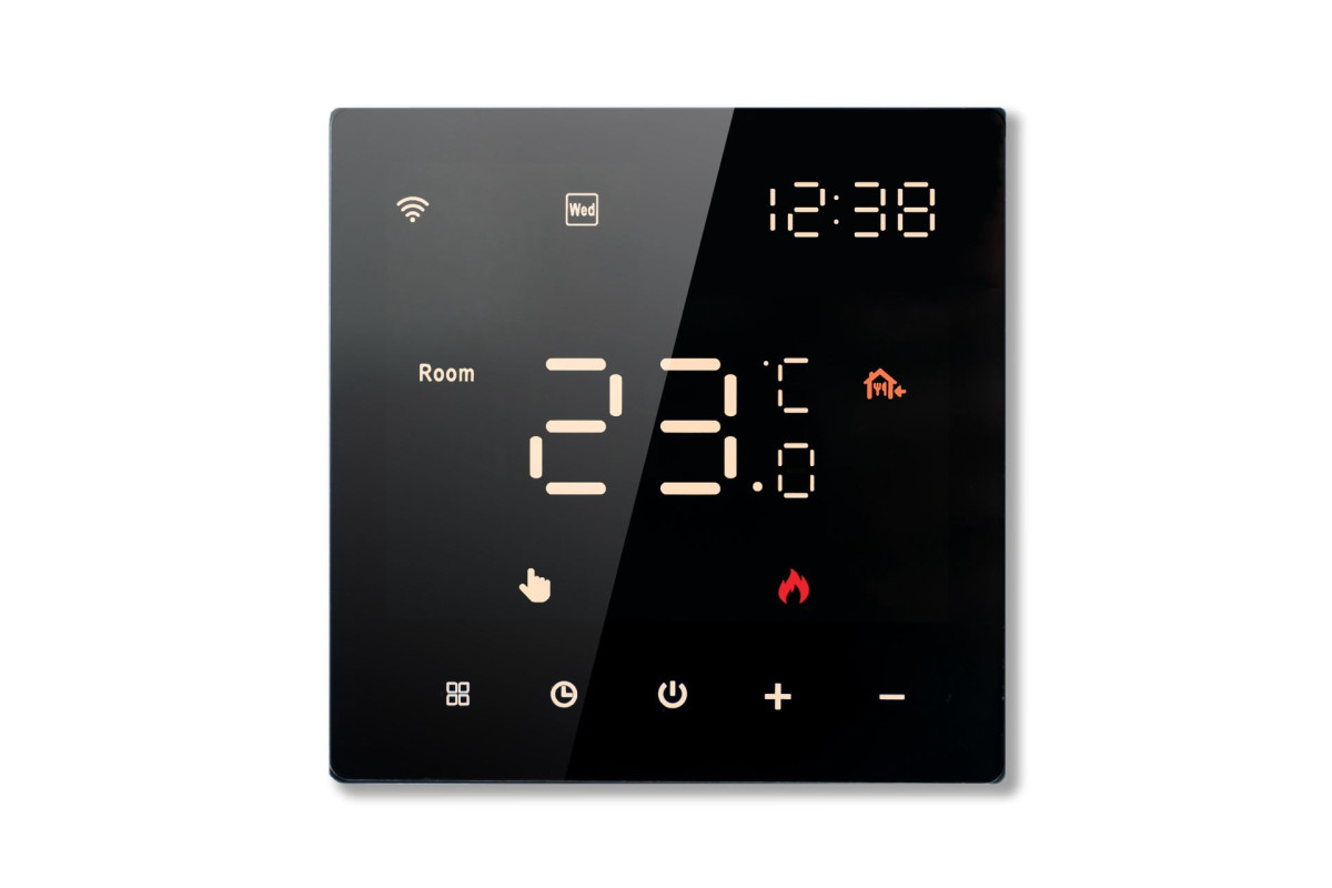 Термостат виглядає дуже стильно - виконаний в білому кольорі і відрізняється класичним сучасним дизайном. Він оснащений зручними сенсорними кнопками і дисплеєм, на якому відображаються всі дані роботи системи, а також поточний час. Змінювати налаштування і програми ви можете на самому апараті.